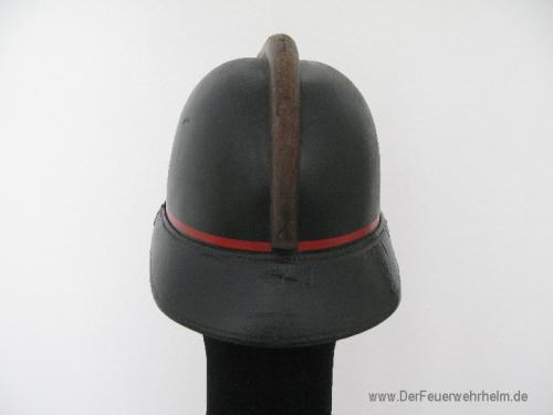 0475 Fire helmet from Switzerland. The leather helmet was worn in western Switzerland, in the canton of Bern. The helmet has no metal parts, no plate mount to eye or neck guard and no metal comb. Instead, a soft, rubbery bead was mounted as a comb. The helmet was designed for firefighter’s electrician. At the front is in red font, the letters EC (électricien companie). This was common only in the French-speaking area of western Switzerland. For the rest area, a red flash was the sign of the fire electrician. The helmet was worn in the period around 1920.