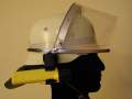 Helmet bowl from aluminum based alloy AL-CU-MG DIN 1725, lacquered yellow- green for a long time persistently, with reconnaissance ribbon RAL 9019. Chin neck strap made of full cattle leather, Interior décor (according to a former DIN 14 940) adjustable. Helmet without neck guard leather. H1 = suitably for head sizes 53-56. H2 = suitably for head sizes 56-59. H3 = suitably for head sizes 59-64. Weight: 0.80 kg. The following accessories optionally were available: Neck guard leather (former DIN 14940) black, to button into all fire department helmets and protection visor made of plexiglas. The "A" at the front stands for it that the fireman is able to wear a breath protection equipment.