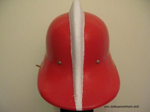 0976 Fire helmet from Spain. The red helmet was made of fiberglass. While the surface is smoothed outside, it is raw inside. The helmet was worn in the period around 1980. Its external shape is very reminiscent of the German firefighter helmets made of aluminum. However, the rear area is pulled very far back. The helmet comb is also very solid and it is made with the helmet bell together. The leather inner helmet is attached to the helmet shell with four split pins. Likewise the leather chinstrap. The helmet is said to have been used by units of the Forest Fire Brigade. At the front is the badge of the city of Madrid. The manufacturer is unknown.